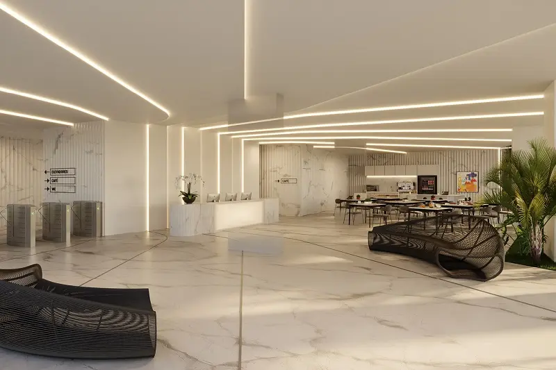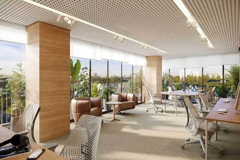 O projeto se destaca por seu design moderno, tecnologia integrada e infraestrutura funcional, com espaços corporativos que priorizam iluminação natural, ventilação eficiente e ambientes flexíveis para atender às demandas do mercado de trabalho contemporâneo. A composição inclui áreas comuns como auditório, salas de reunião, espaços de convivência e serviços de apoio, proporcionado uma experiência completa para colaboradores e visitantes.